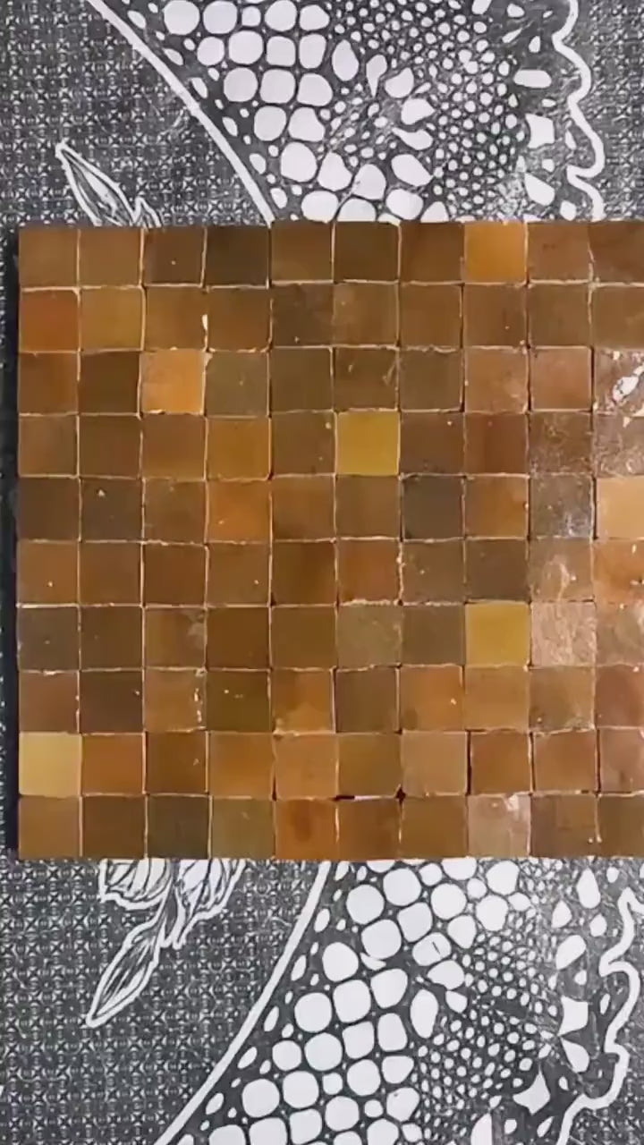 SIZE: 1 inch (2.5 cm) square Zellige tiles in panels of 25 x 25 cm with plastic mesh backing and glue fixative.