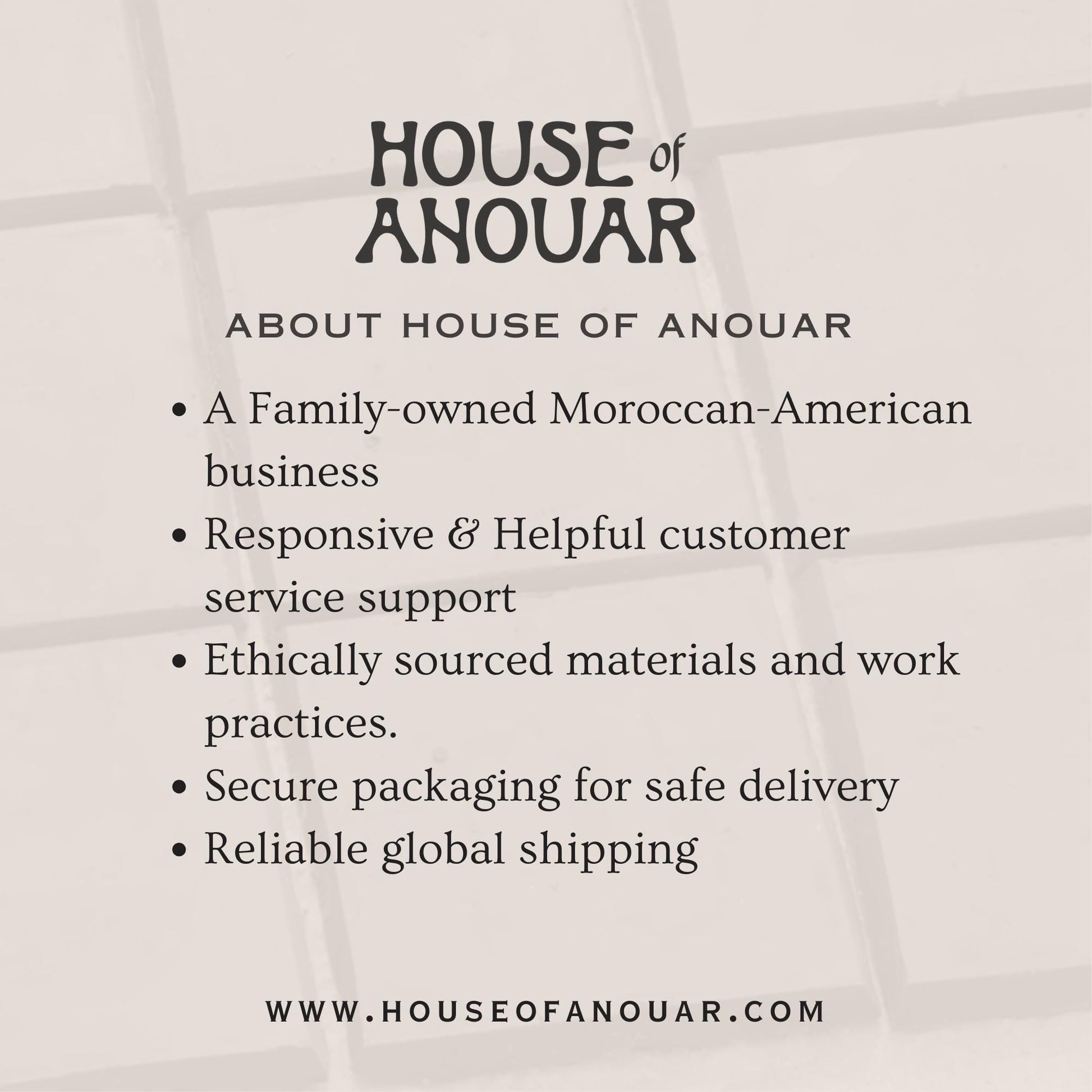 Transform your home into a work of art with our handmade zellige tiles. House of Anouar operates out of Marrakesh, Morocco, owned and operated by a Moroccan-American family with 9 years of experience exporting Moroccan goods.