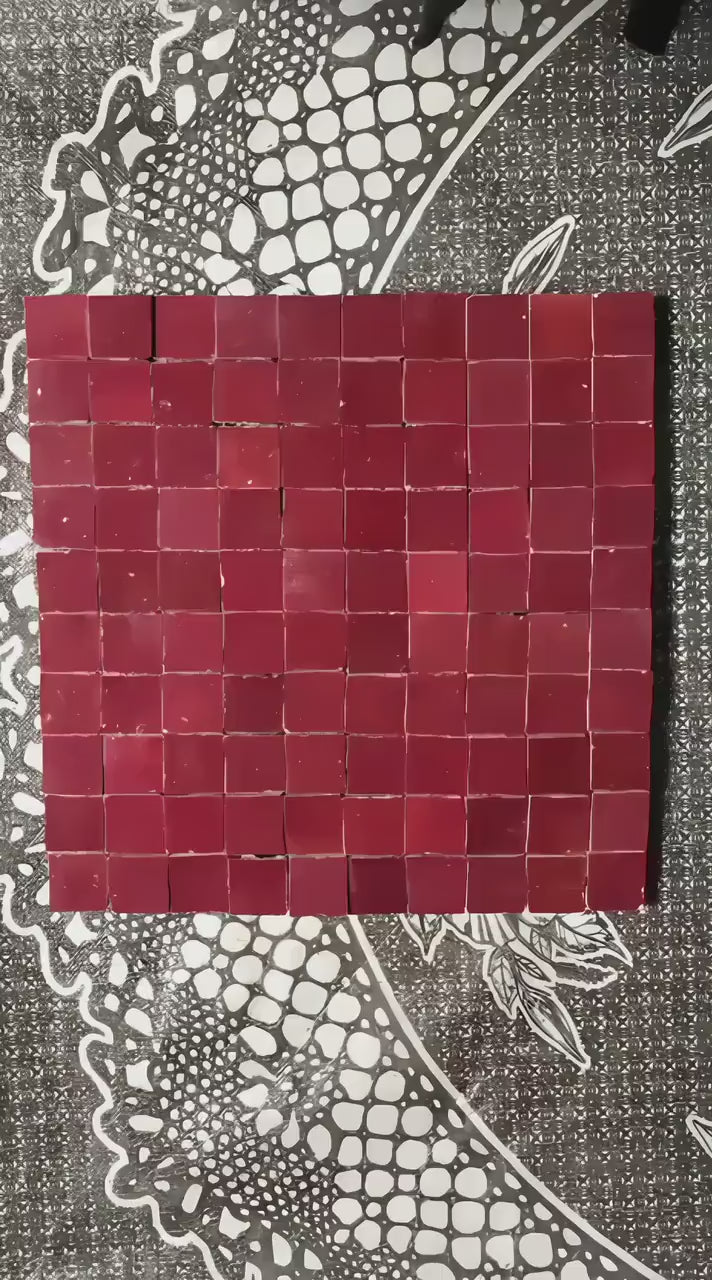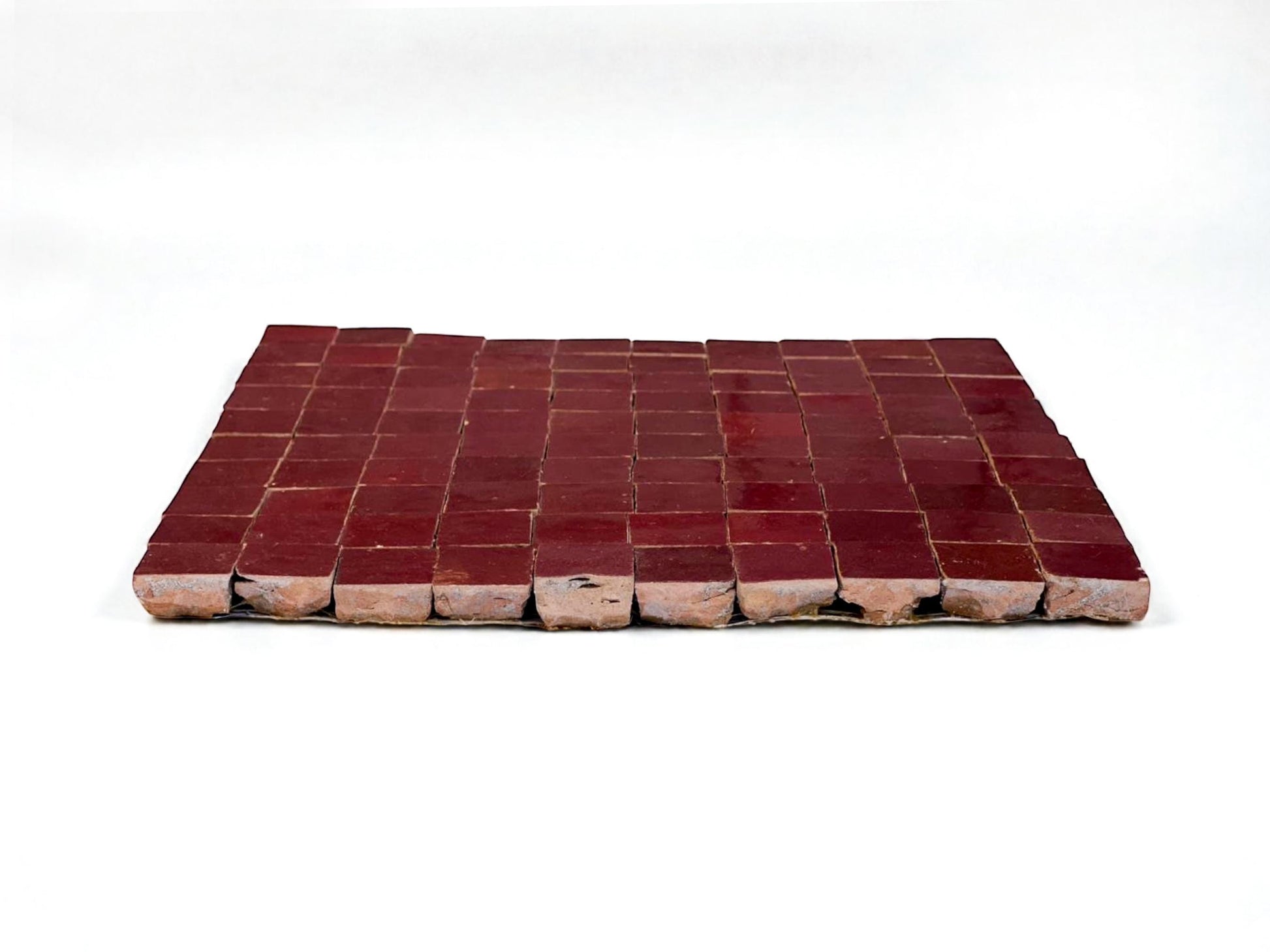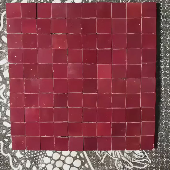 SIZE: 1 inch (2.5 cm) square Zellige tiles in panels of 25 x 25 cm with plastic mesh backing and glue fixative.