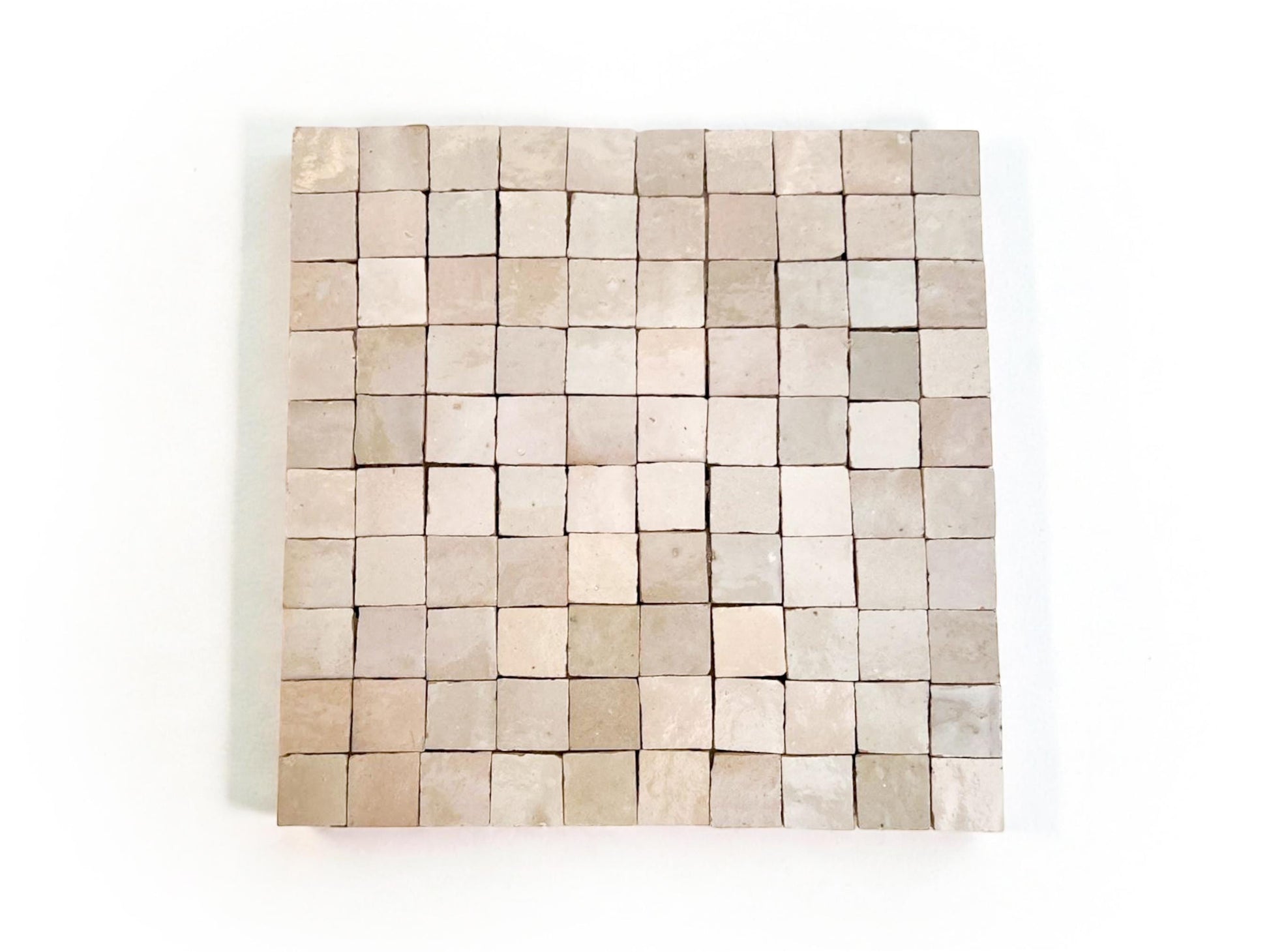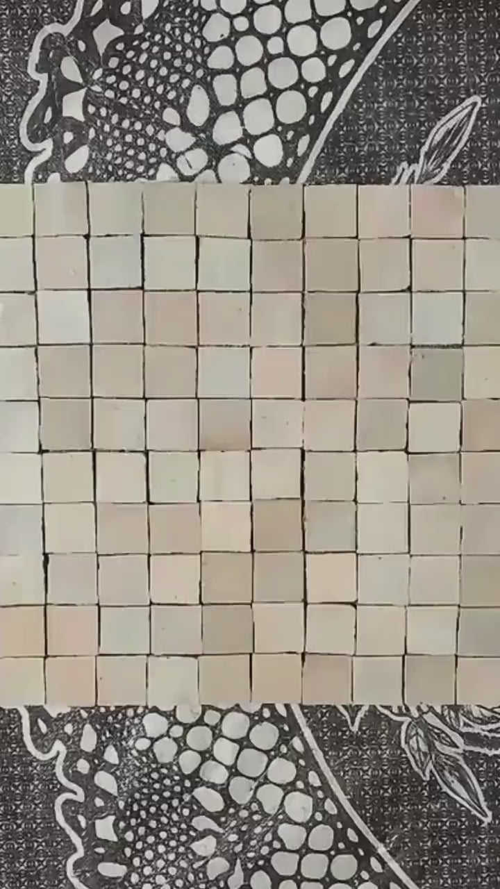 SIZE: 1 inch (2.5 cm) square Zellige tiles in panels of 25 x 25 cm with plastic mesh backing and glue fixative.
