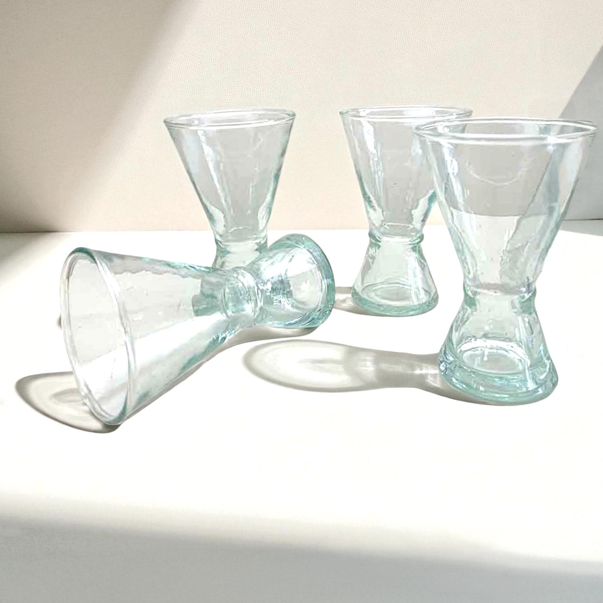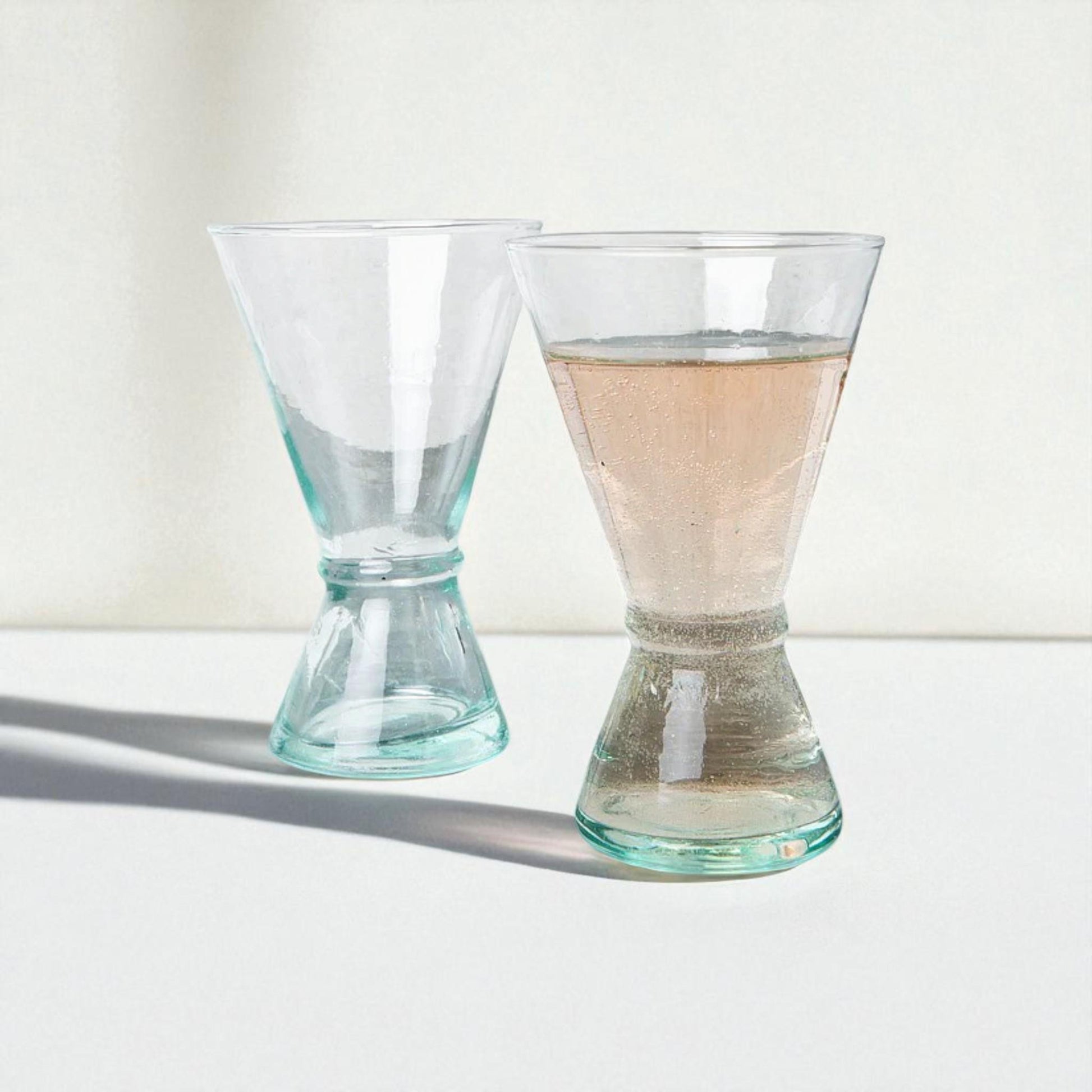These handmade Beldi wine glasses feature a striking double-cone silhouette, narrow in the center with wide, flared top and bottom sections that mirror each other. Crafted by artisans in Marrakech using recycled glass, each piece has a slightly irregular shape, subtle bubbles, and a textured surface that reflects the traditional Moroccan glassblowing process.