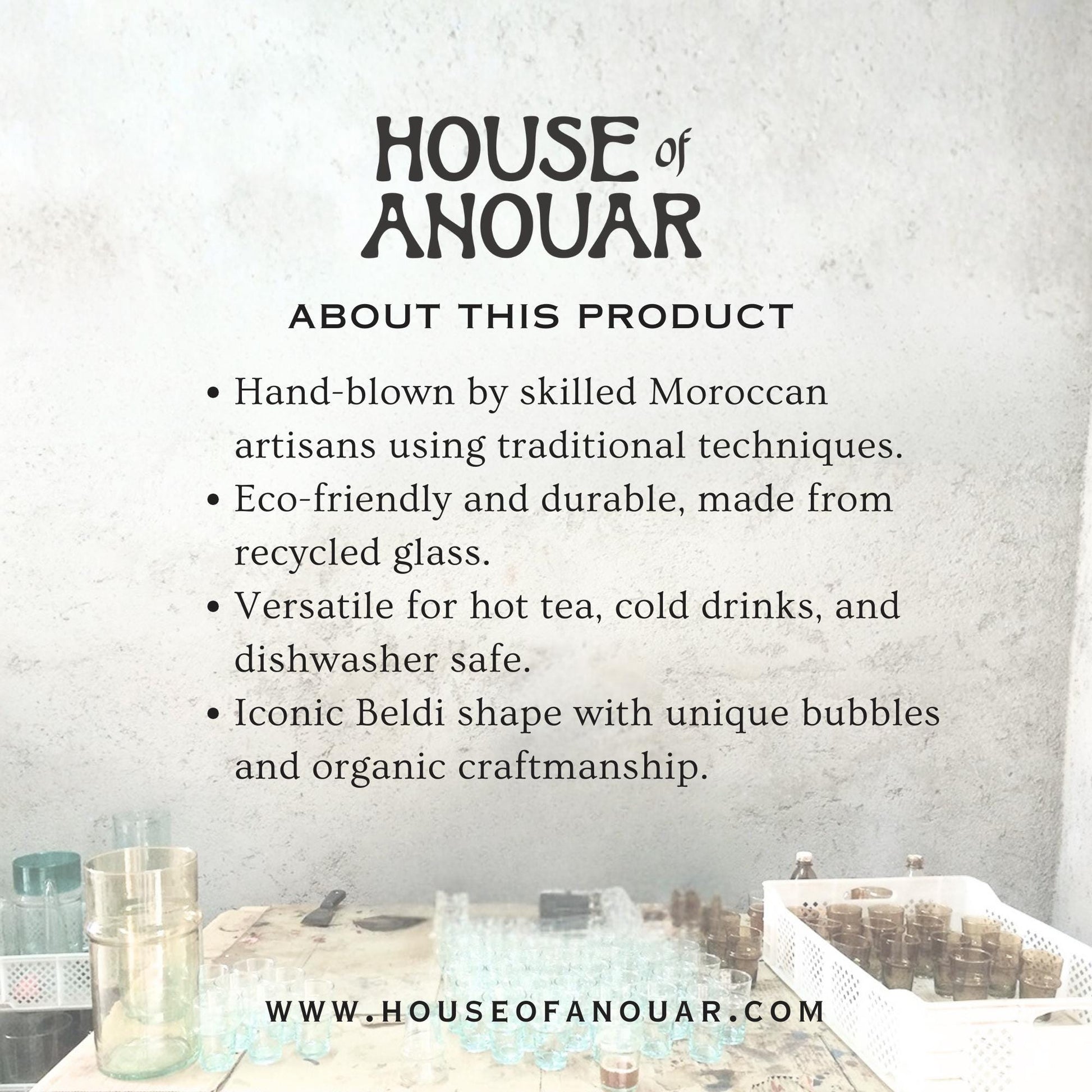Made entirely from reclaimed glass bottles and shaped by hand, these glasses support traditional Moroccan craftsmanship and eco-conscious production. Each piece is one-of-a-kind.