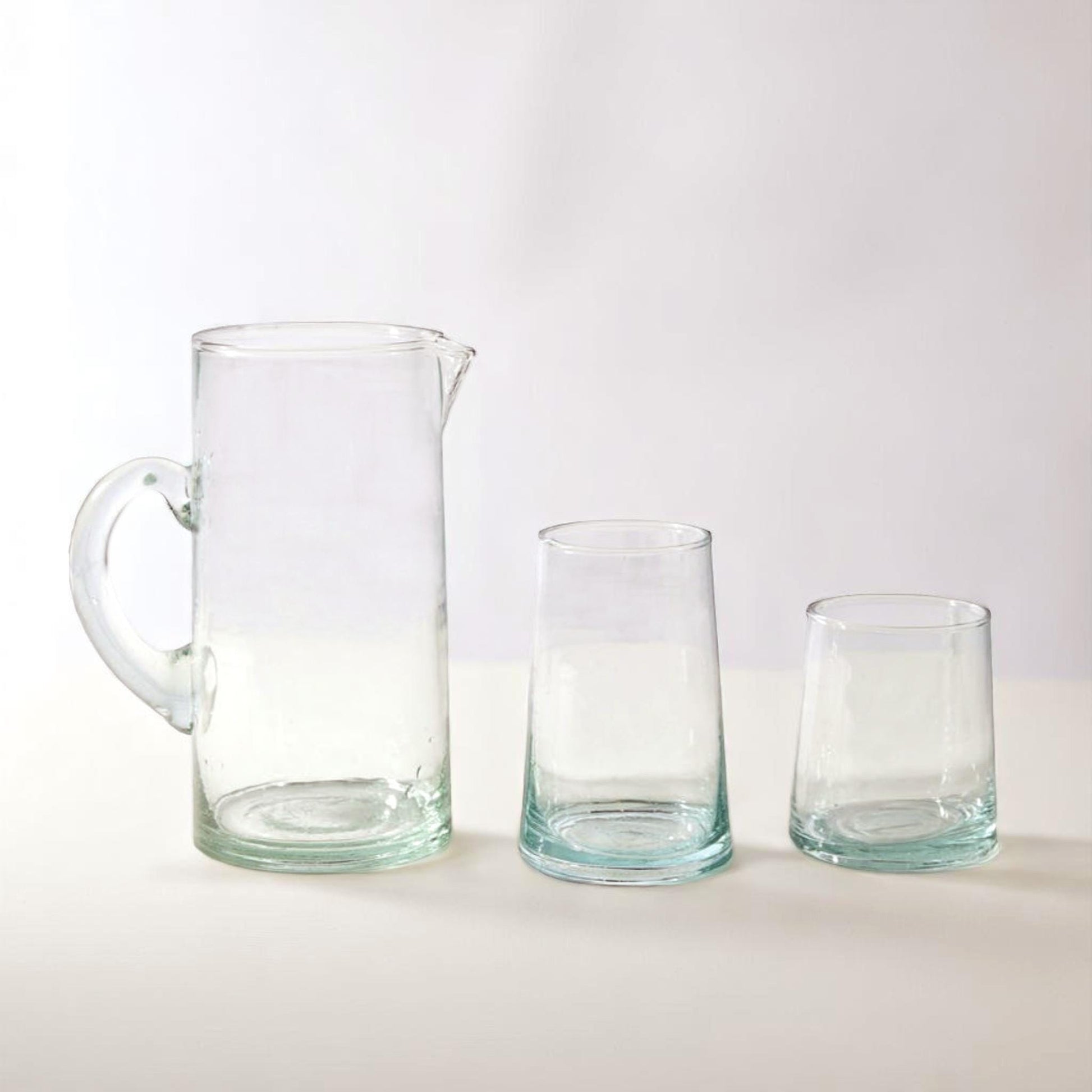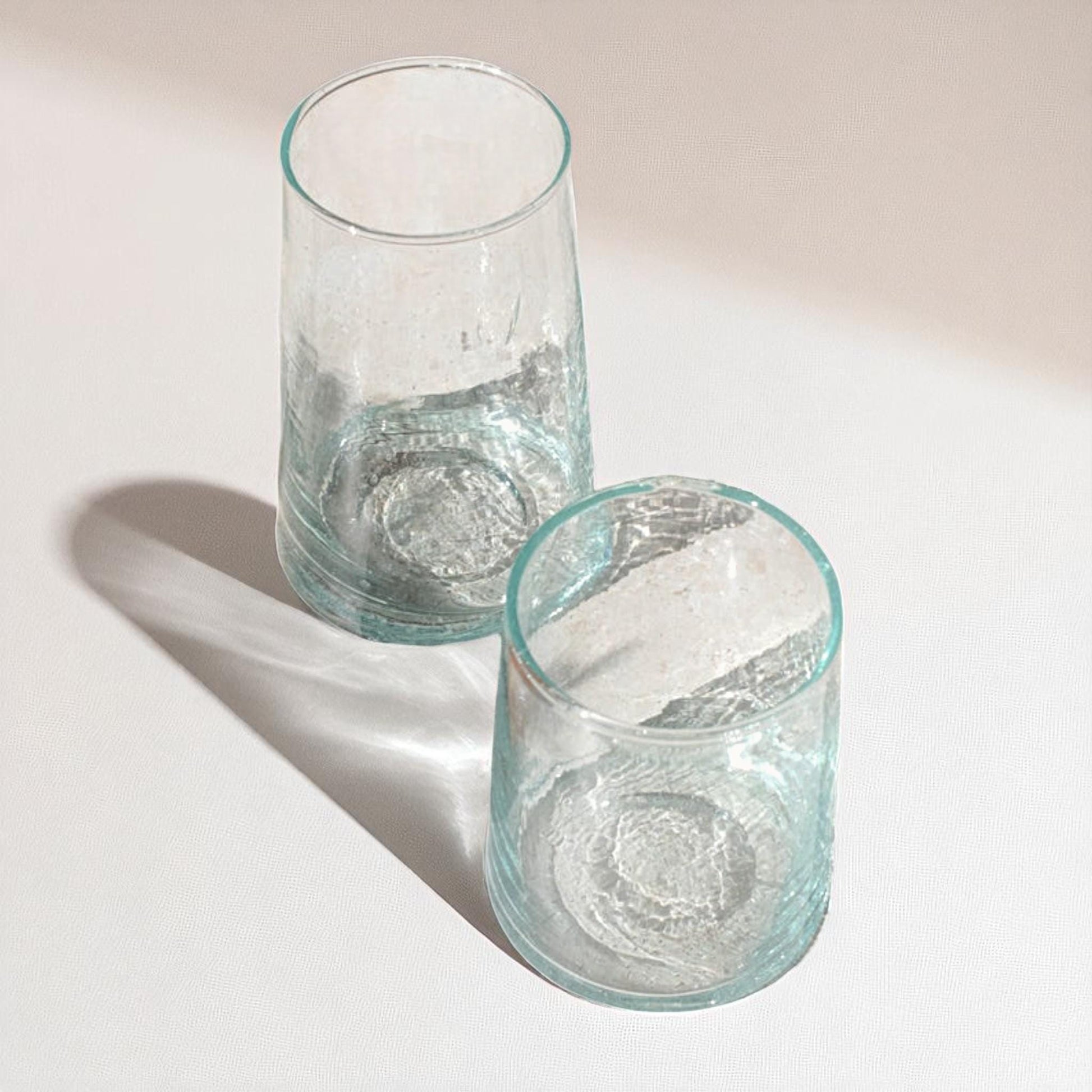 Crafted from 100% recycled glass and made by hand, each set supports sustainable living and the continuation of Morocco's artisan glassblowing tradition.